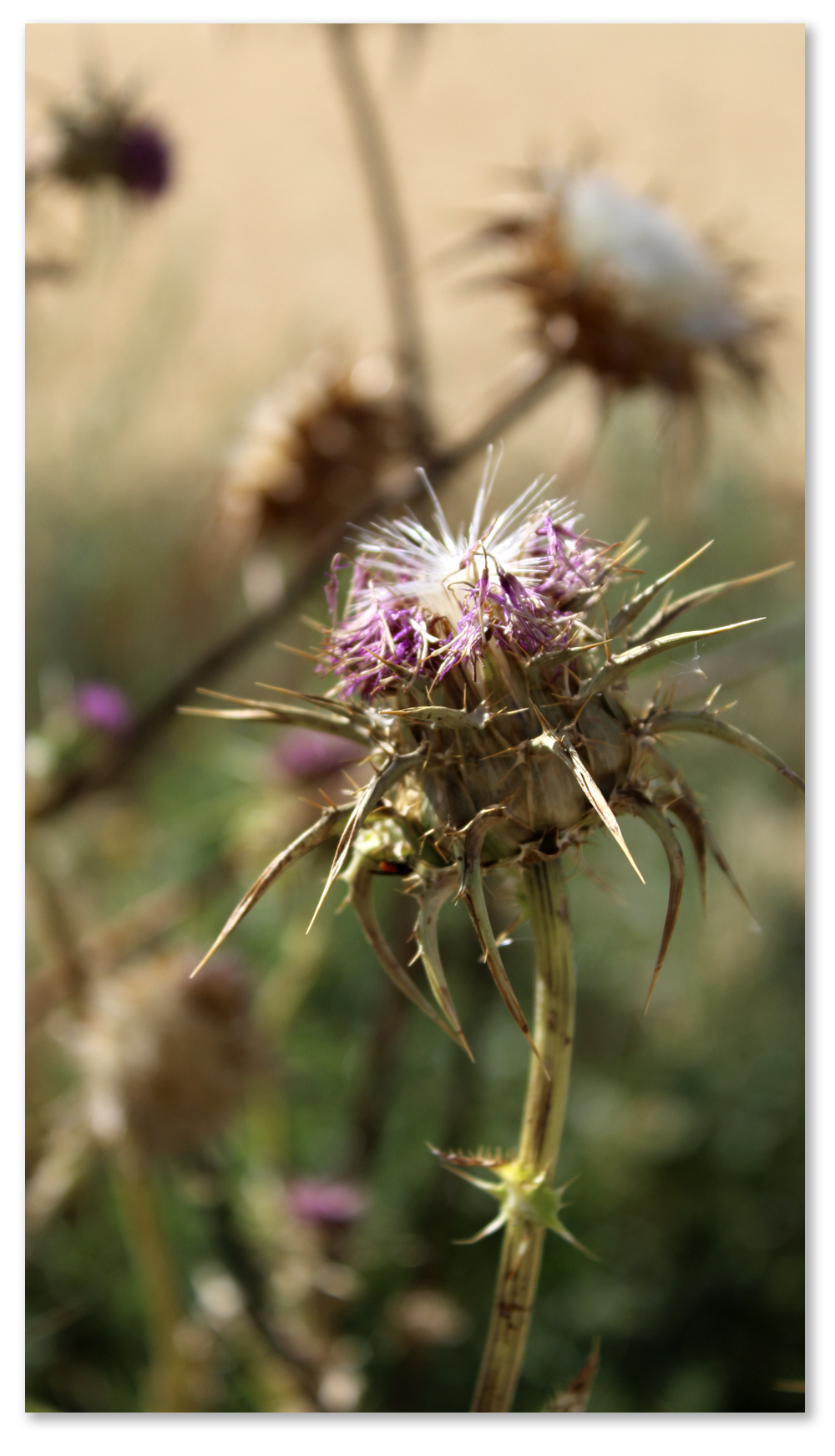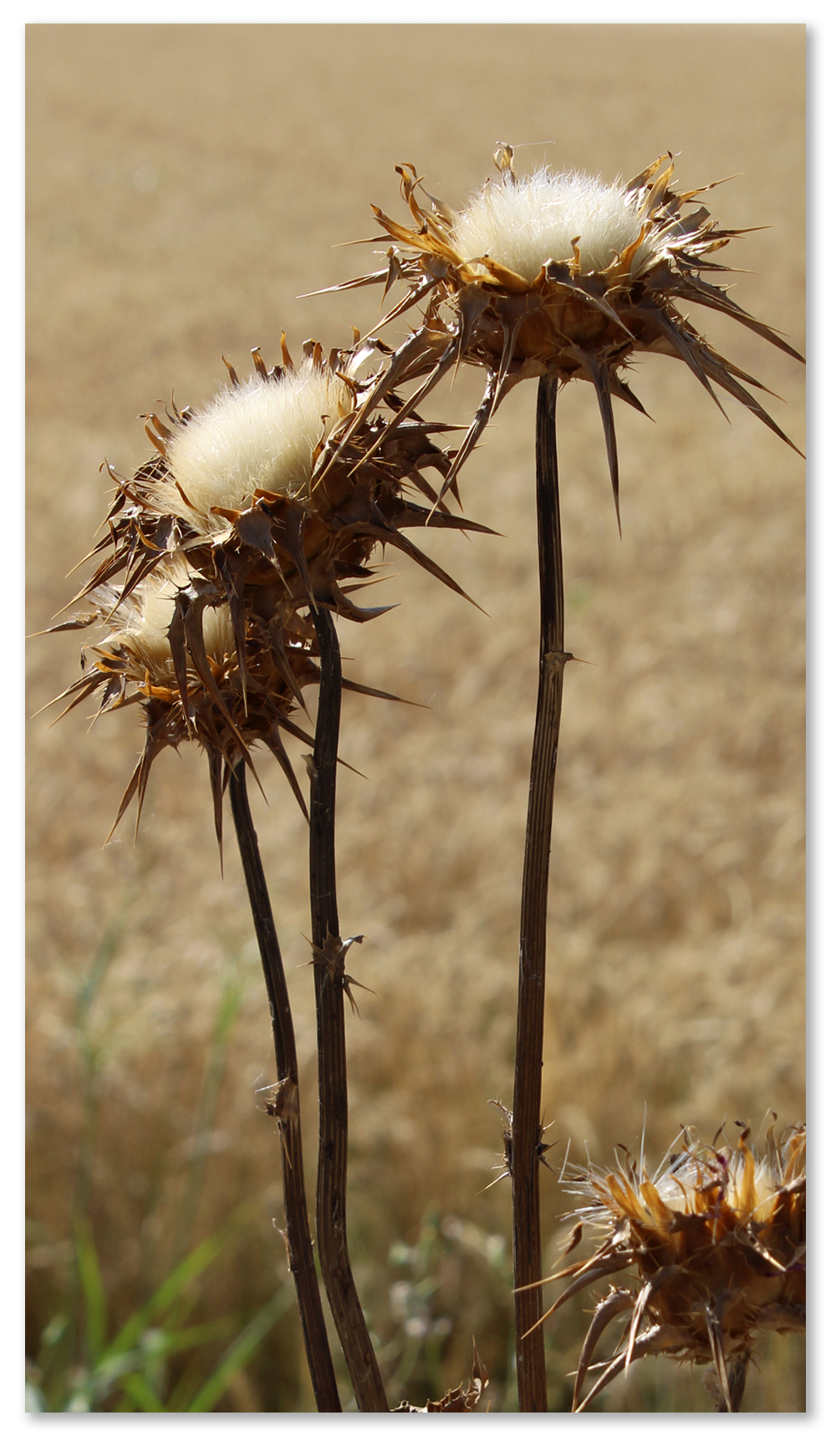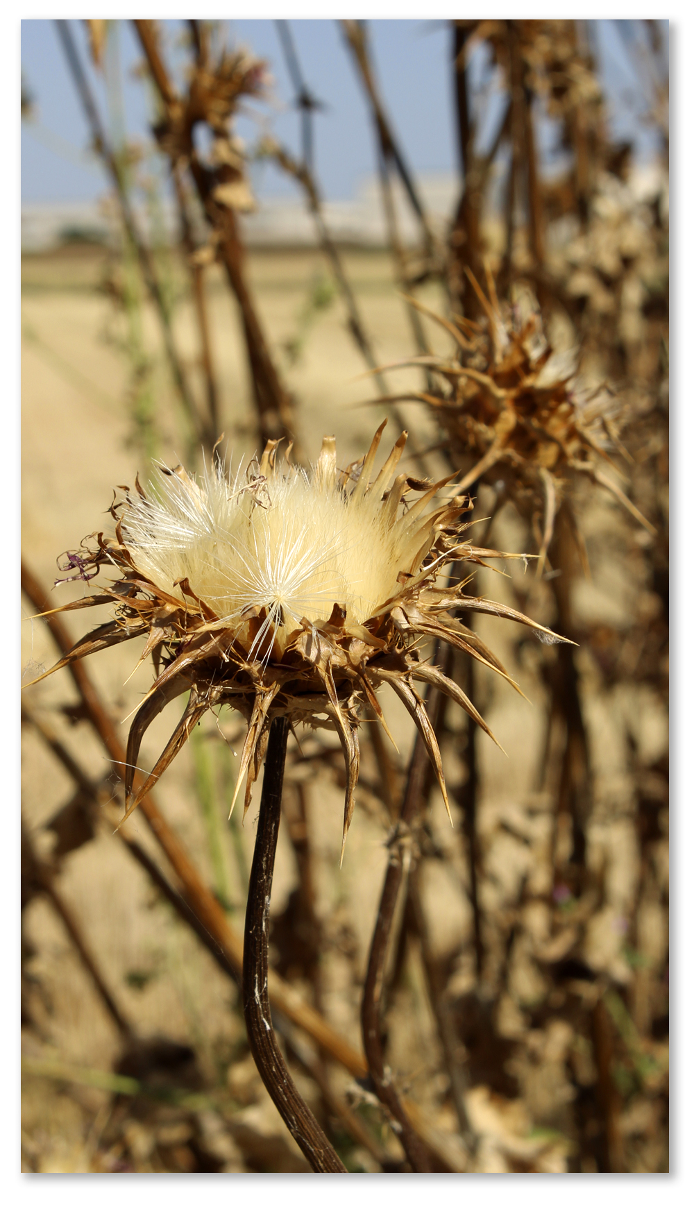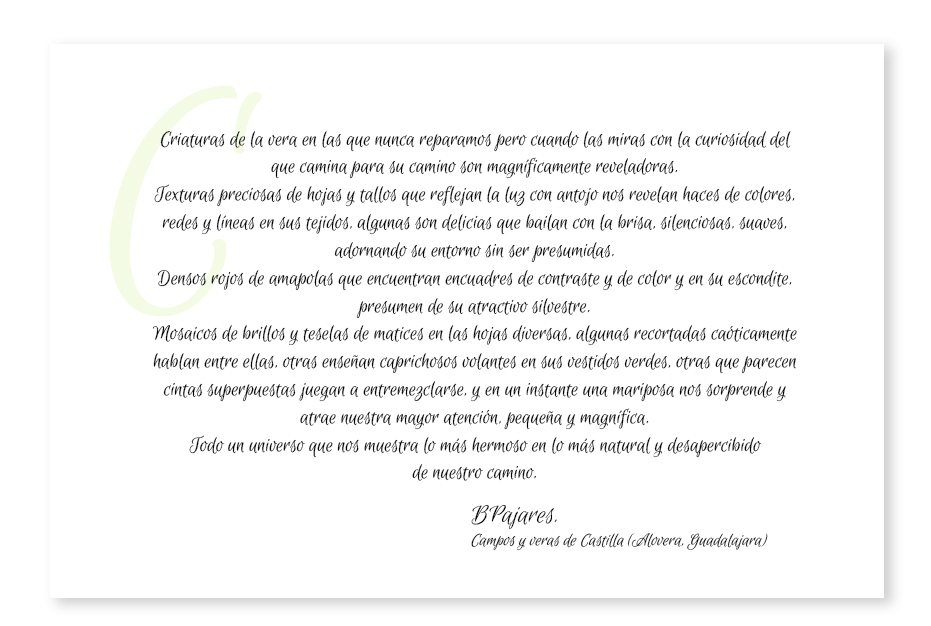 Esta vez el recorrido lo marca la lente de mi cámara que se vuelve caprichosa con los macros. Empiezo a bajar el ritmo de mi paso por un camino de tierra flanqueado por campos sembrados de trigo y decorados en sus veras por todo tipo de plantas silvestres y empiezo a fotografiar lo que la lente ve y solo puedo intuir.